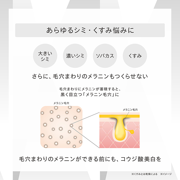 美白(美白とはメラニンの生成を抑制し、シミ・ソバカスを防ぐこと)有効成分コウジ酸が、シミの根源(メラノサイト)に直効き。
